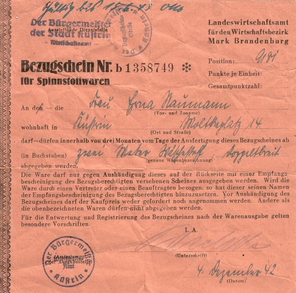 Frau Gaedke hat zum 1. Okt. gekündigt, ihr Vater ist nach Grünberg i/ Schlesien versetzt und da gehen die jungen Leute mit, da sie sich keine Wohnung halten können. […] Römhold [Otto Römhold, Lederhandlung, Markt 116] steht sehr wacklig, von Carow – Neustadt [Franz Carow, Weißwaren, Zorndorfer Str. 40] hat sich der Älteste aus Nahrungssorgen erschossen.
