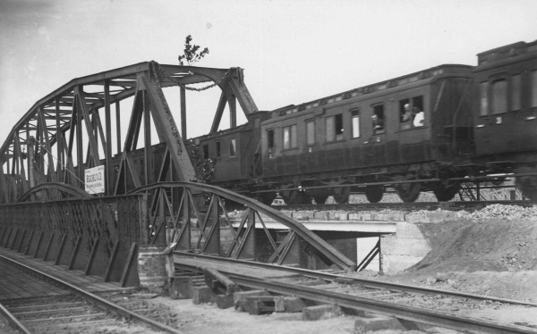 Bild 23: Der erste Personenzug fährt über die neue Oderbrücke am 1. Juli 1926