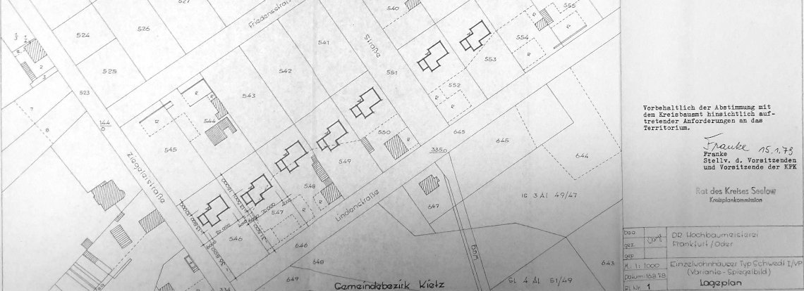 Man erzählt aber auch, man hätte Probleme dabei gehabt, die benötigten Baumaschinen, wie Bagger, nach Kietz zu bringen - komisch, dass man sie aber nach Manschnow schaffen konnte. Etwas kurios ist der hier dargestellte Lageplan: Er ist 1979 datiert, enthält aber die 15 Jahre zuvor an der Friedenstraße errichteten Neubauten nicht - sondern noch die nach dem 2. Weltkrieg erhaltenen Reste der früheren bäuerlichen Wohnhäuser.