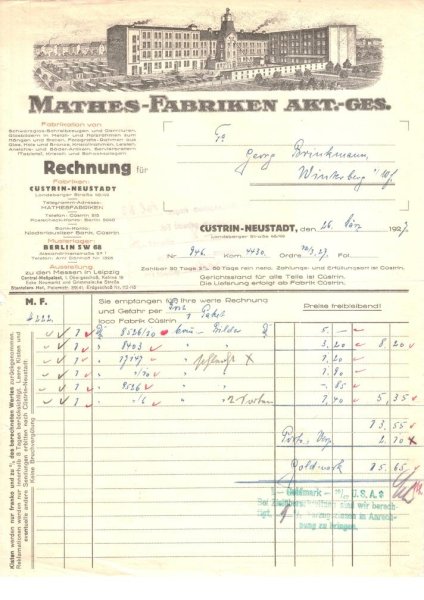 Während des 2. Weltkrieges produzierte die Firma laut Zeitzeugen auch Munitionskisten. Die Fabrik in Küstrin existierte bis zur Zerstörung der Stadt 1945. Zumindest die Tochtergesellschaften in Ostende und Brüssel existierten nach dem Krieg noch weiter, einige Dokumente aus dem Jahr 1949 (eines ist rechts zu sehen) belegen das.